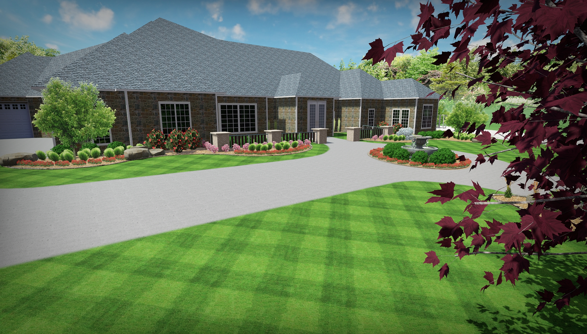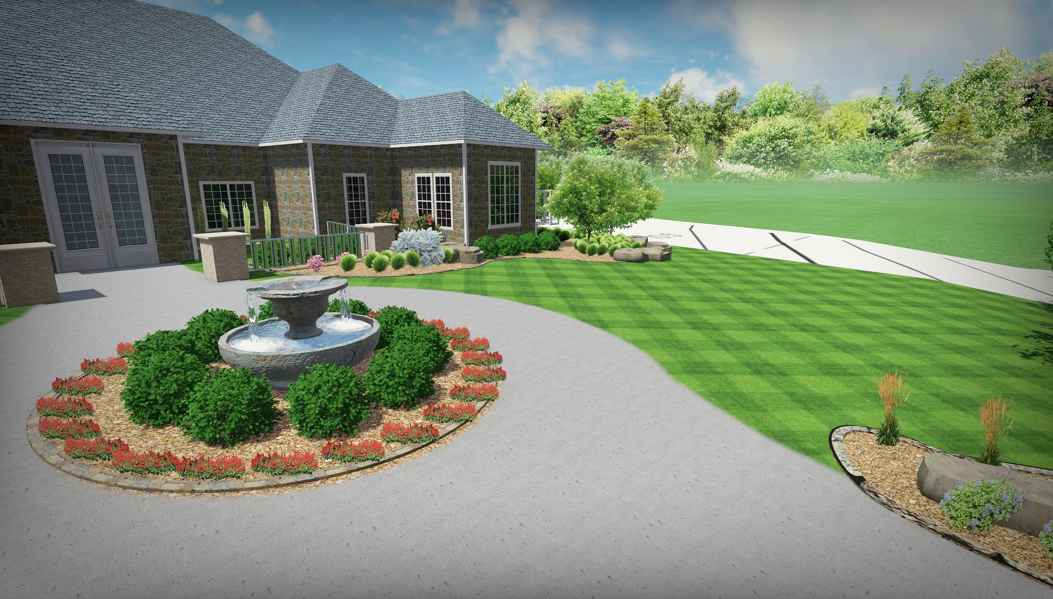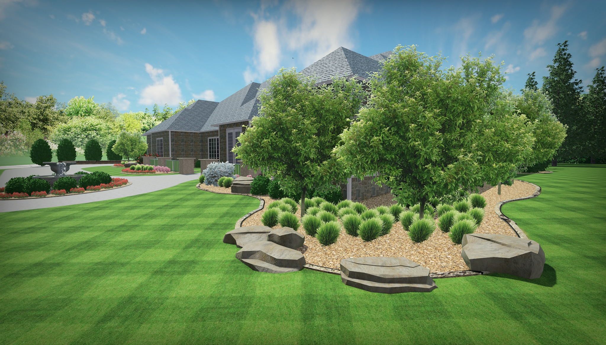 To tie the landscape seamlessly into the home’s design, we installed custom stone edging and accent features that coordinate with the home’s natural stone veneer.